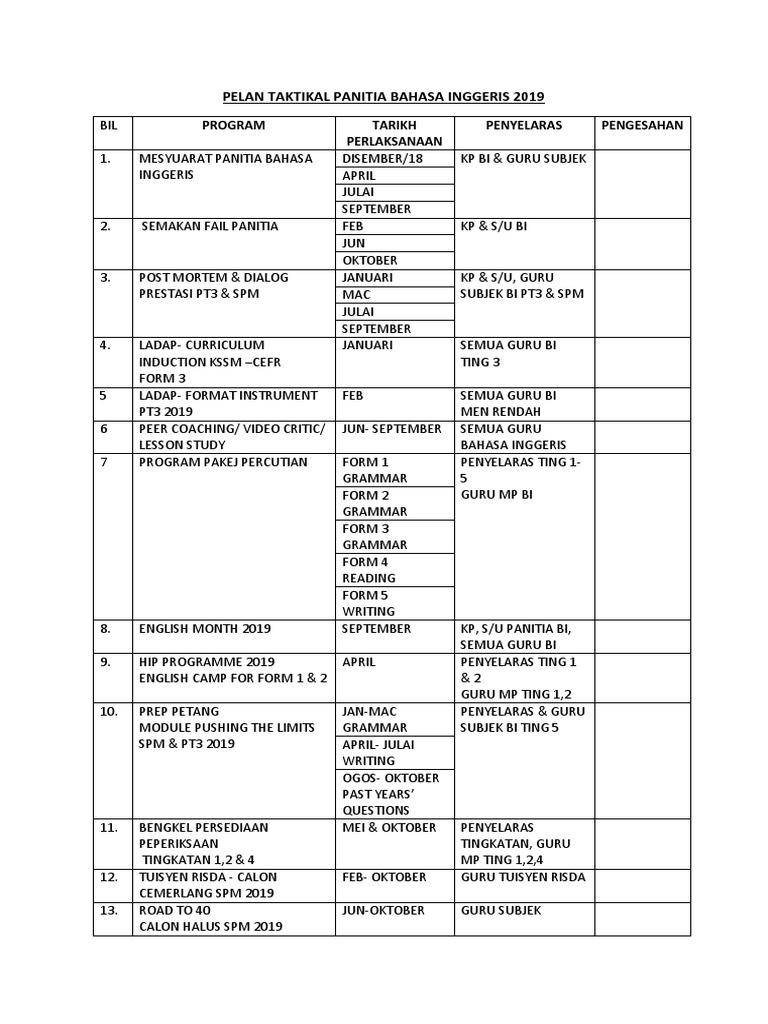 Pelan Taktikal Panitia Bahasa Inggeris 2019 Pdf
